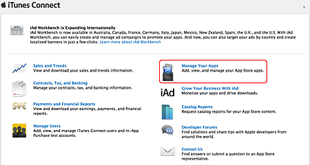 Step 1: 連結iTunes Connect,並選進Manage Your Apps.