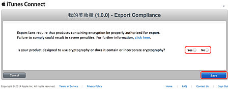 這邊詢問你的App設計時是否有加密程序? 如果沒有特別寫加密程式, 就選擇No即可.